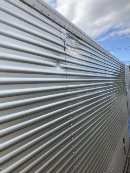 写真はウイング車(4トン車)の荷台側面修理前です。側面のアルミ波パネル交換しました。また状態によっては、応急修理も可能です。