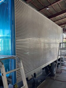 箱車修理、コーナー部ぶつけてしまった場合でも状態によっては修理が可能です。コーナーポストや壁の波パネルを全交換しました。